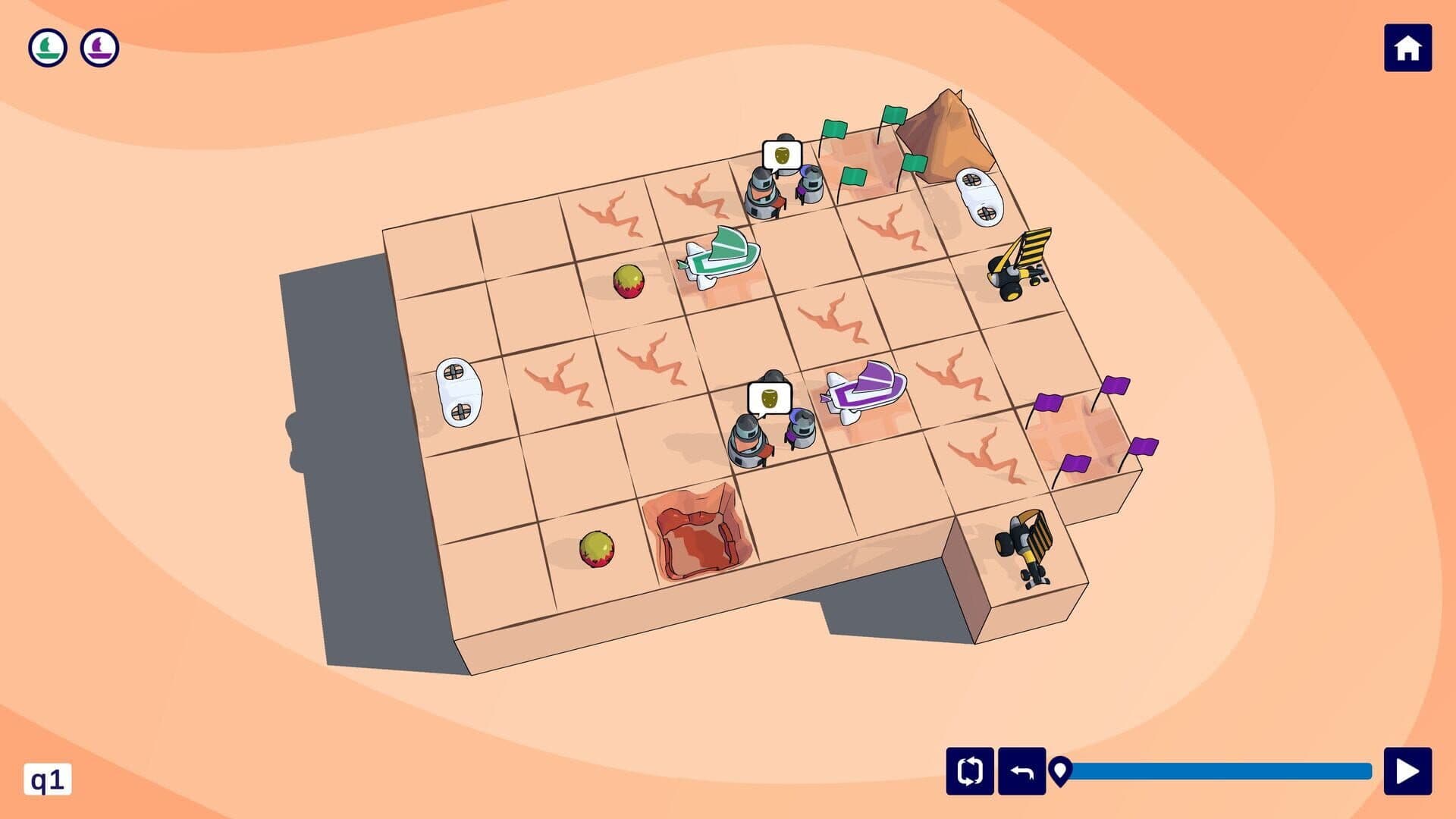 TRAILS is a cozy puzzle game in which players guide sandships across a crumbling desert to reach isolated outposts. Players draw lines on a grid in order to plot the movement of ships that cannot selfintersect or visit a tile twice. When done drawing they can start the simulation and see the outcome their routs produced. If the ships reach their goal without collision and while satisfying all victory conditions they win and advance to the next level. Over the course of the game more and more interacting mechanics get added to the game, requiring players to supply outposts with vital cargo, unlock new passages, juggle items, avoid hostile drones and support allied ships.