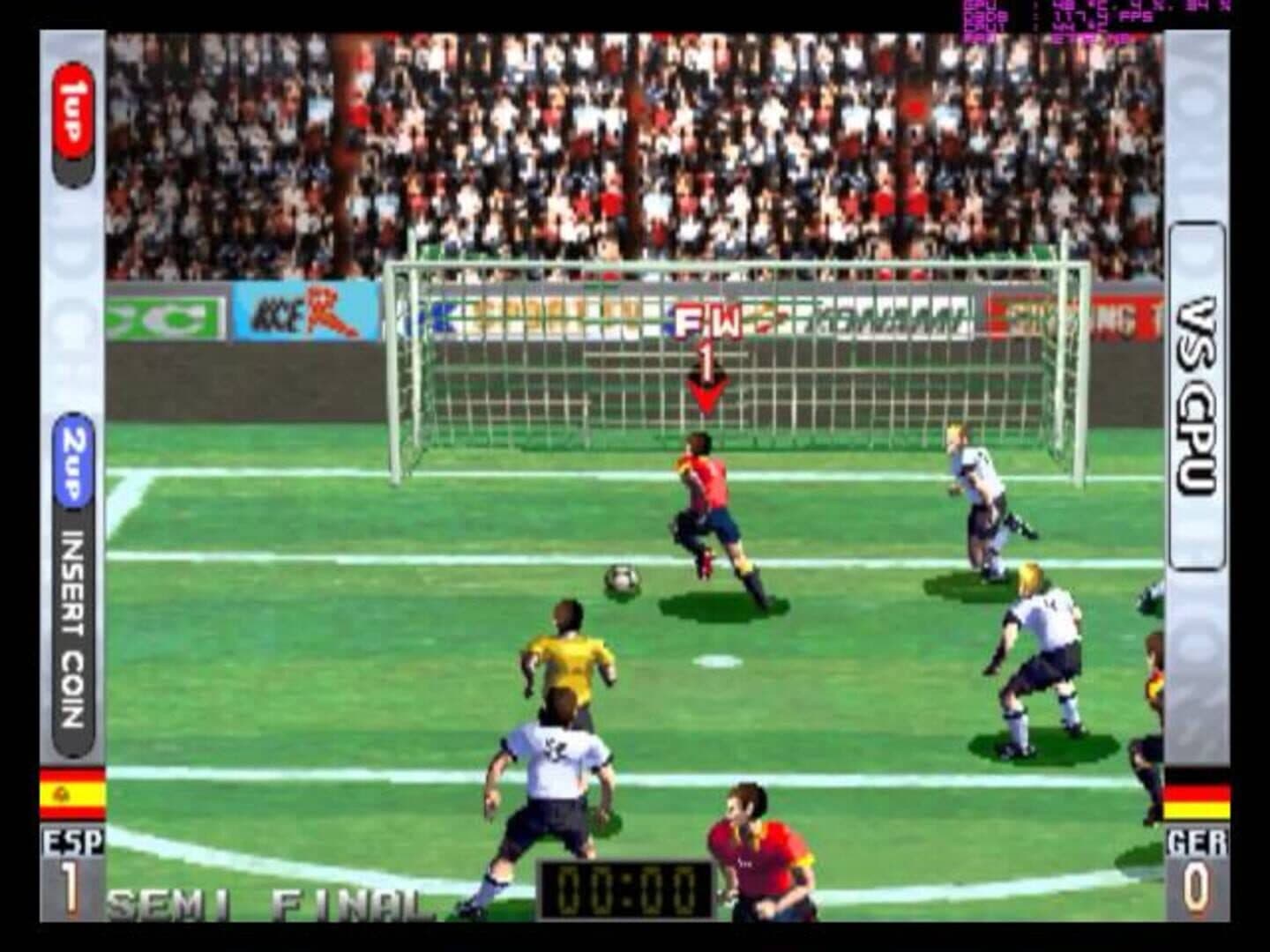 28 different national teams are selectable in this soccer game. You can select from two 3-D views: half-top view or side view. When two monitors are used, one screen can be in half-top and the other in side view during the game. (Sinopsys from Arcade Database)