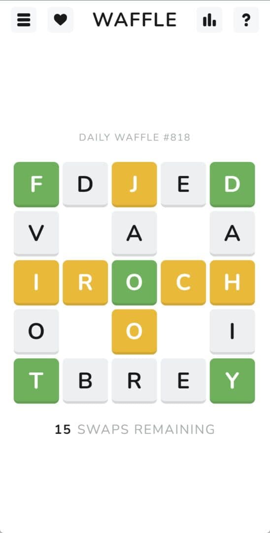 Waffle is a daily word game of letters and logic. Rearrange the letters to solve the words. The top score is awarded for solving the puzzle in the least number of moves.
