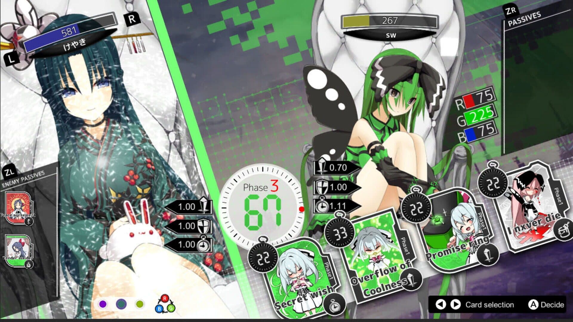 #Four players real-time battle royal! This game is a battle royal game which in-game time goes by in real-time. The main game mode is randomly matching world battle mode, but you can also play friend match mode if you want to play with friends casually. #Update the AI girl and fight against other players! By gaining cards called "piece of memory", you can update your girls and/or attack opponents' girls. As the girls get updated, their bodies gain various color. The colors are expressed in three values, which are "R", "G" and "B". The values themselves become the girl's status and her appearance. #Color affection makes brand new strategy! "R", "G" and "B" affect each other. Since this game is real-time four players game, you always need to check two things. How other players are making their girls and how you should make your girl to compete with them. This feature will give you a brand new strategical battle! #This game is recommended to these gamers!