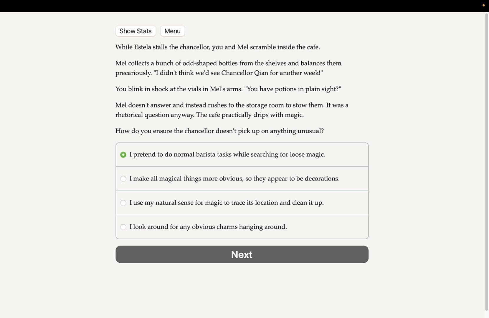 Will you spill the tea about the secret, cozy magical cafe on your college campus? Brew potions and romance on coffee dates with your new friends! A text-based novel of magic and romance, with hundreds of choices and without graphics or sound effects.