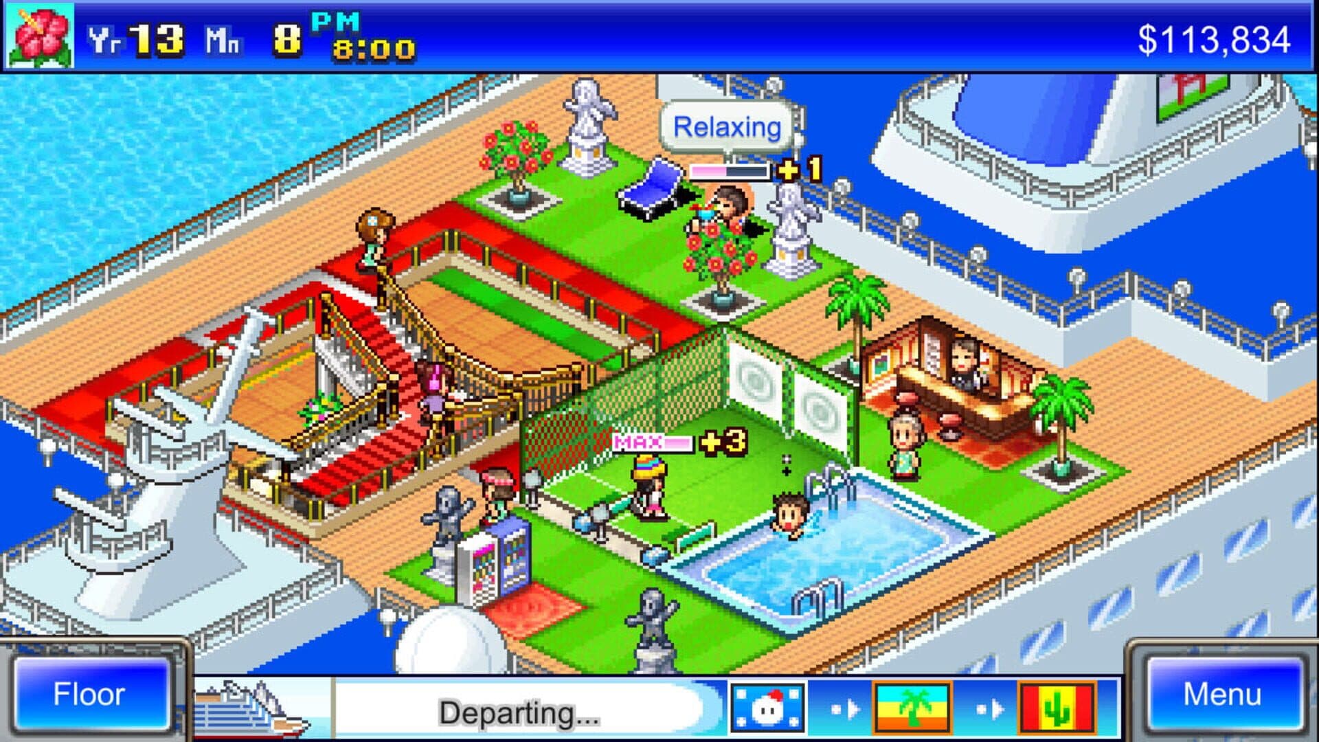 Get ready to take the helm of history's grandest, most over-the-top luxury cruise liner for an unforgettably addictive excursion at sea! Deck your own ship with everything from lavish suites and first-class restaurants to casinos and hot tubs! You call the shots as you travel the world, visiting every country on the map--even entertaining royalty with tours truly fit for kings! Put the right facilities next to each other and you'll score big points with passengers and reviewers. Amass enough fame and even celebrities will come flocking when you're in port! Can you turn your sea buggy into a 5-star floating paradise? Put on your captain's hat and find out in World Cruise Story!