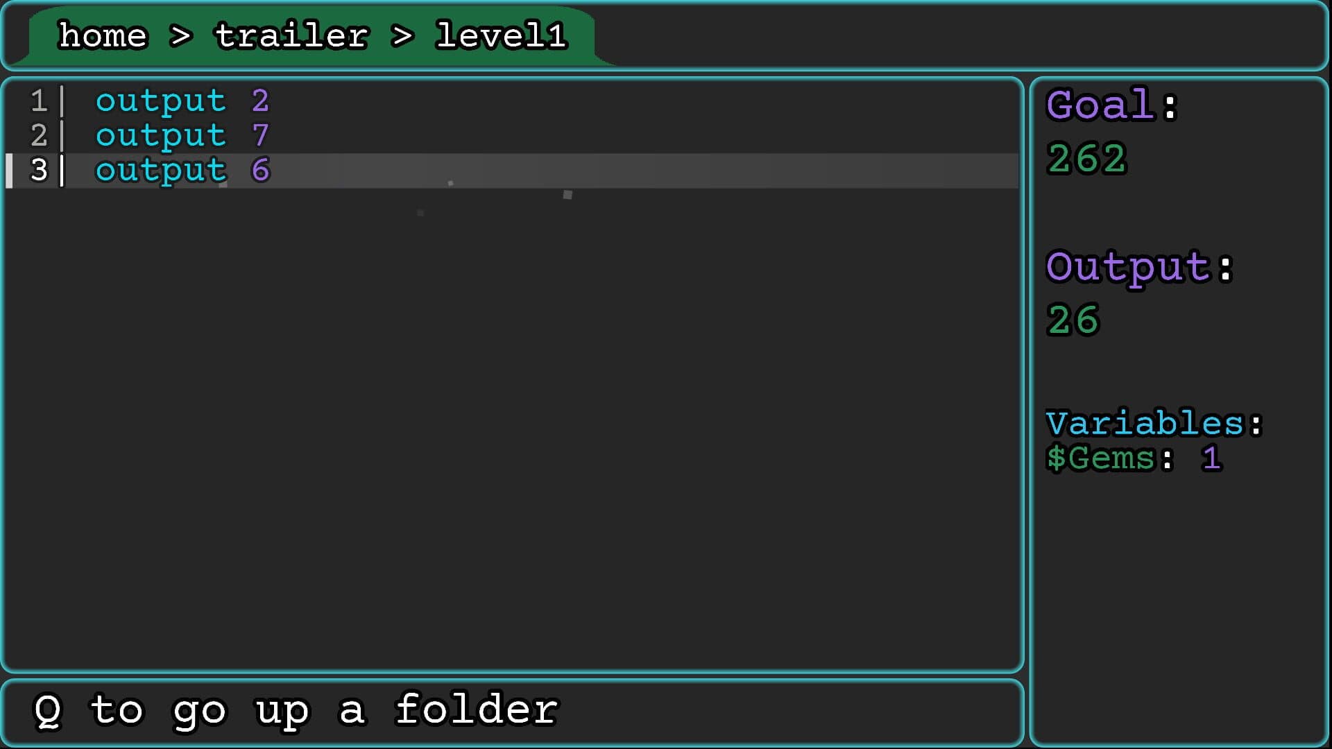 A programming puzzle game where bugs are eating away your code! One problem: YOU CAN'T TYPE. Navigate and run pre-existing lines of code to make your output match the goal!