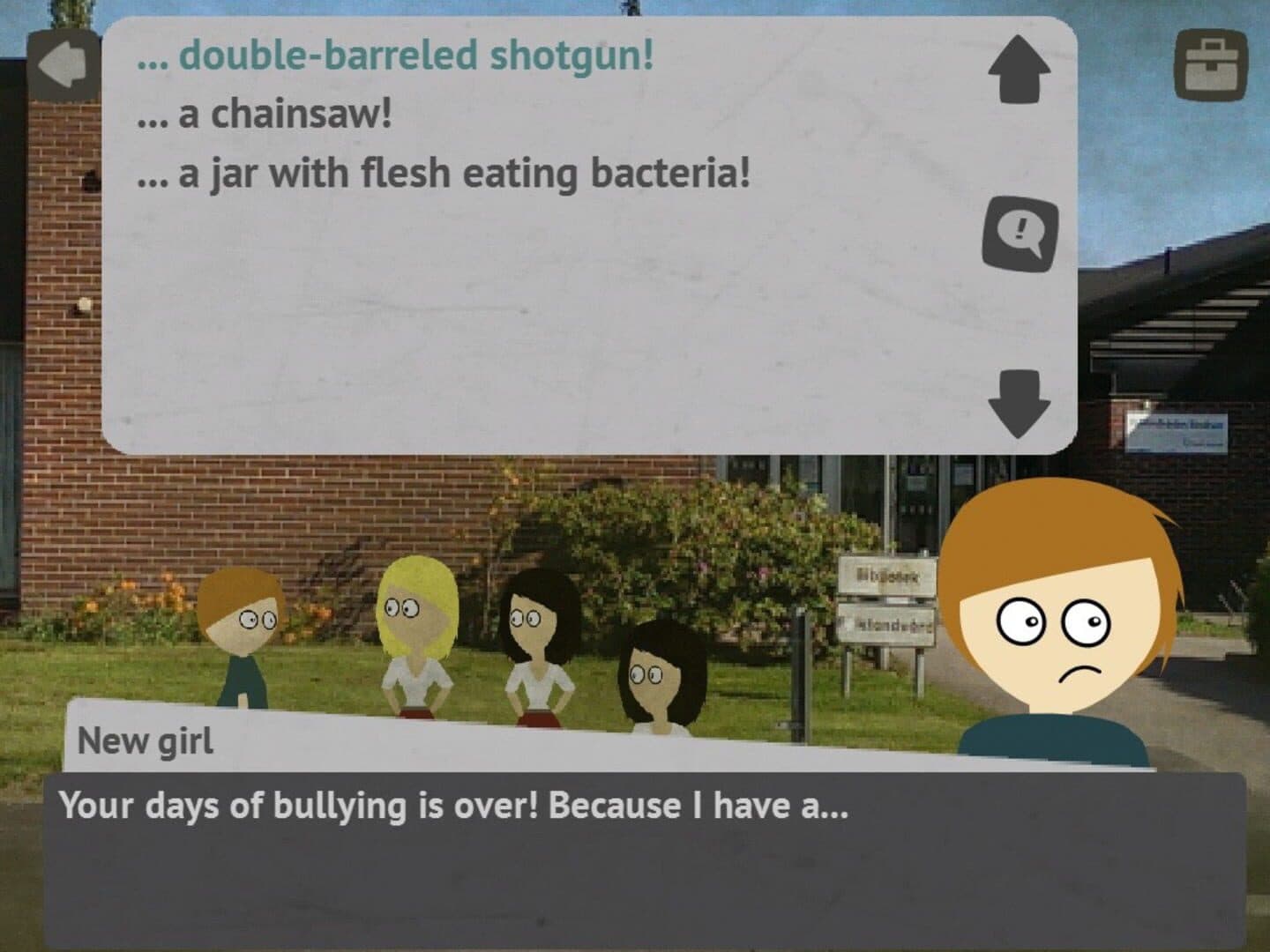 Tova used to be a real bully back in school, many years ago. One day a strange shadow knocks her door and brings back a slice of her dirty past. Visit the fearsome Castle Death Spider(tm), meet lots of zany characters, play rock paper and scissors against an evil warlock, participate in the surreal family show ”Guests with chests”, find out what’s behind the secret door in Tovas basement (but there IS no basement… or is there?), go beyond space and time to a secret alternative dimension… and make choices that shapes the story and it’s resolution. ”You. Me. Heaven.” is an independent follow-up on the critically-acclaimed surreal point-and-click-adventure ”You. Me. Hell.”, but doesn’t require you to have played the first game first. This is not a game about heroes. This is a game about a shy bullied girl, and about a former bully’s journey through anguish and remorse.