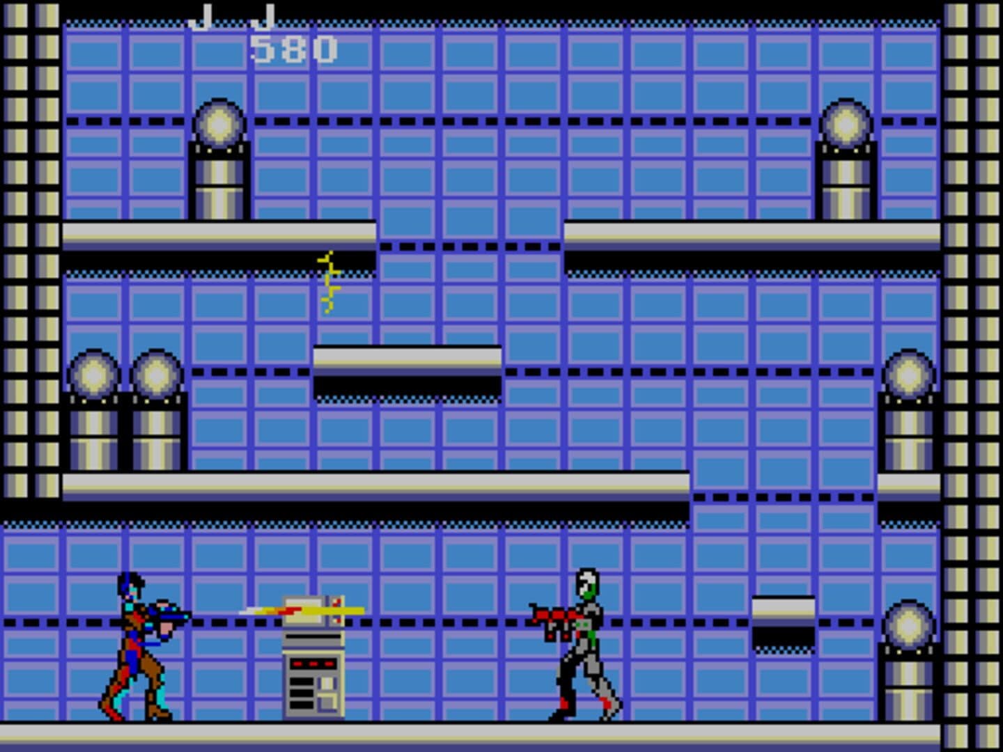 Are you ready for the ultimate danger? You're alone, outnumbered and there's no guarantee you'll make it alive. You're J.J. Your objective: secretly infiltrate the underground labyrinth of The Norsa Empire and steal their plans for domination. Armed with the ultra speed and power of the Zillion Laser, your mission is complex. And sheer strength will not win this one alone. You'll need more brains than brawn in this sophisticated operation. So, how will you think your way to victory? With cunning strategy and memory to guide you successfully through the maze which awaits. Where once inside, you'll find the information needed to destroy the Norsas and restore peace forever.